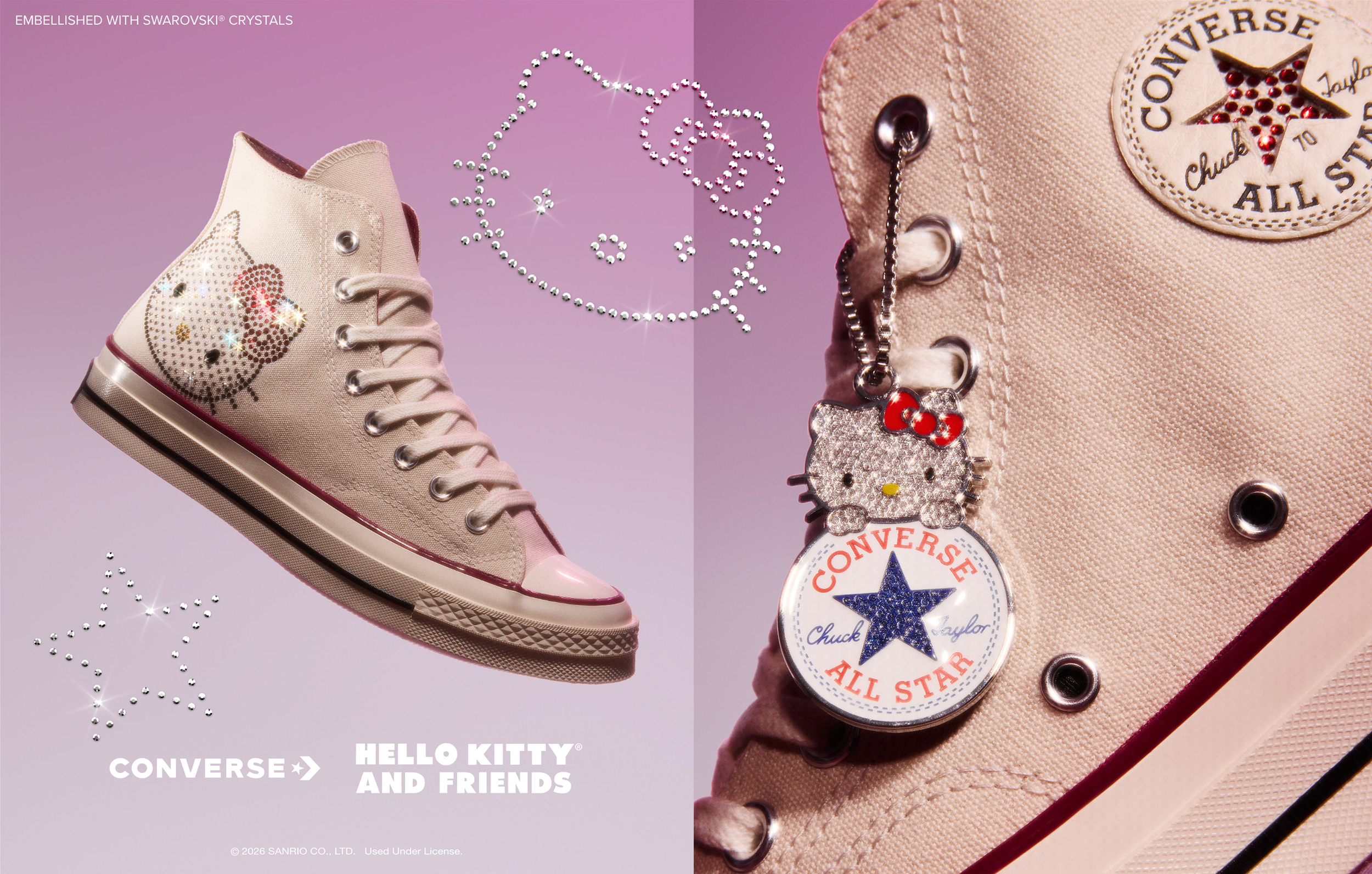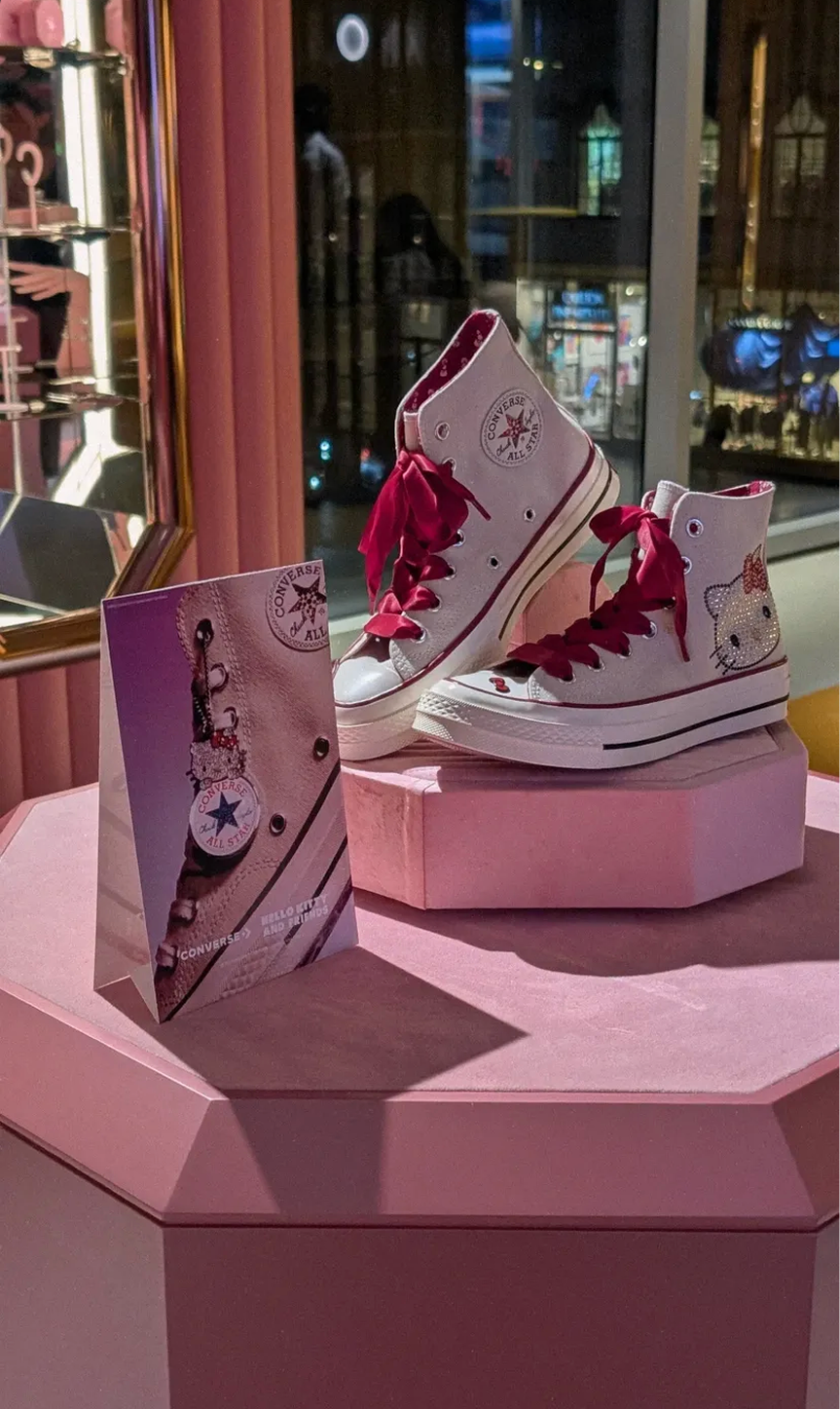 This event was an exclusive preview of the Hello Kitty Chuck 70 at the Swarovski HQ in New York. Elements from the product and design language were brought to life in the premium space for creators to experience. The space included a 5ft crystal-encrusted replica of the shoe charm, product displays throughout the space, a DJ booth, and a special visit from Hello Kitty herself.